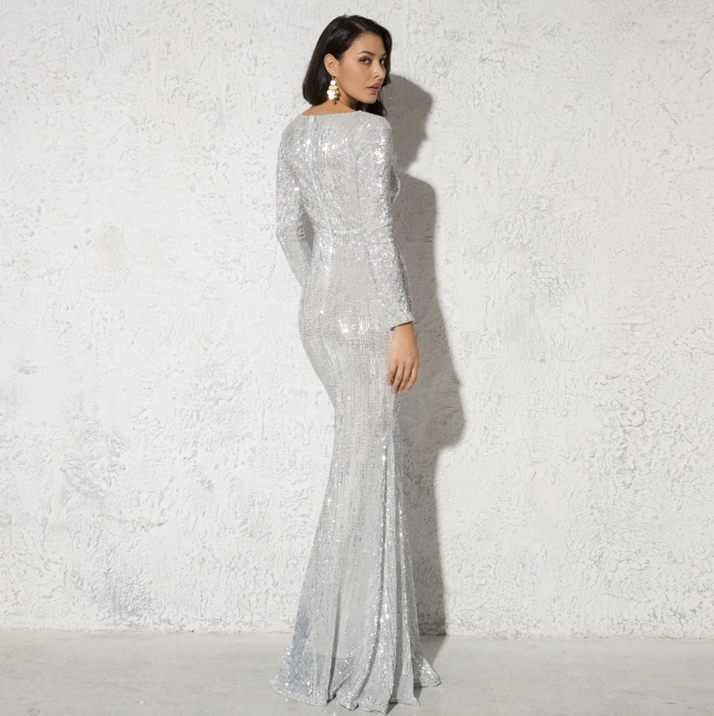 Blow them all away in the Amirah Gown! With thousands of sequins, this gown sparkles like crazy! This gown is a modest floor length dress with long sleeves, a rear train, a high neck and a high back. This gown is perfect for a formal, prom, special event or wedding.