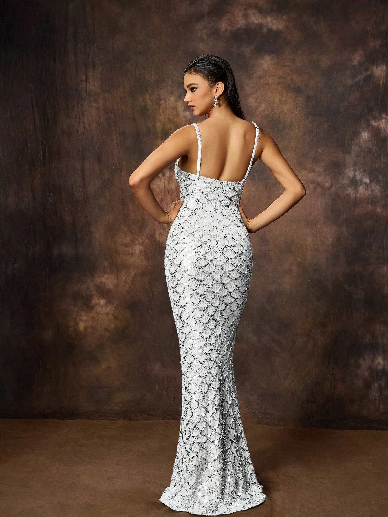 We named this dress after Disney's Ariel because she's giving us mermaid vibes. The Ariel Gown is a stunning floor length formal dress that features some very unique details - an illusion neckline, sequins in fish scale patterns, a padded bust, adjustable straps and a neckline that is embellished with beads and crystals. This dress is figure hugging and made from stretch fabric. Perfect as a wedding dress, gala or prom.
