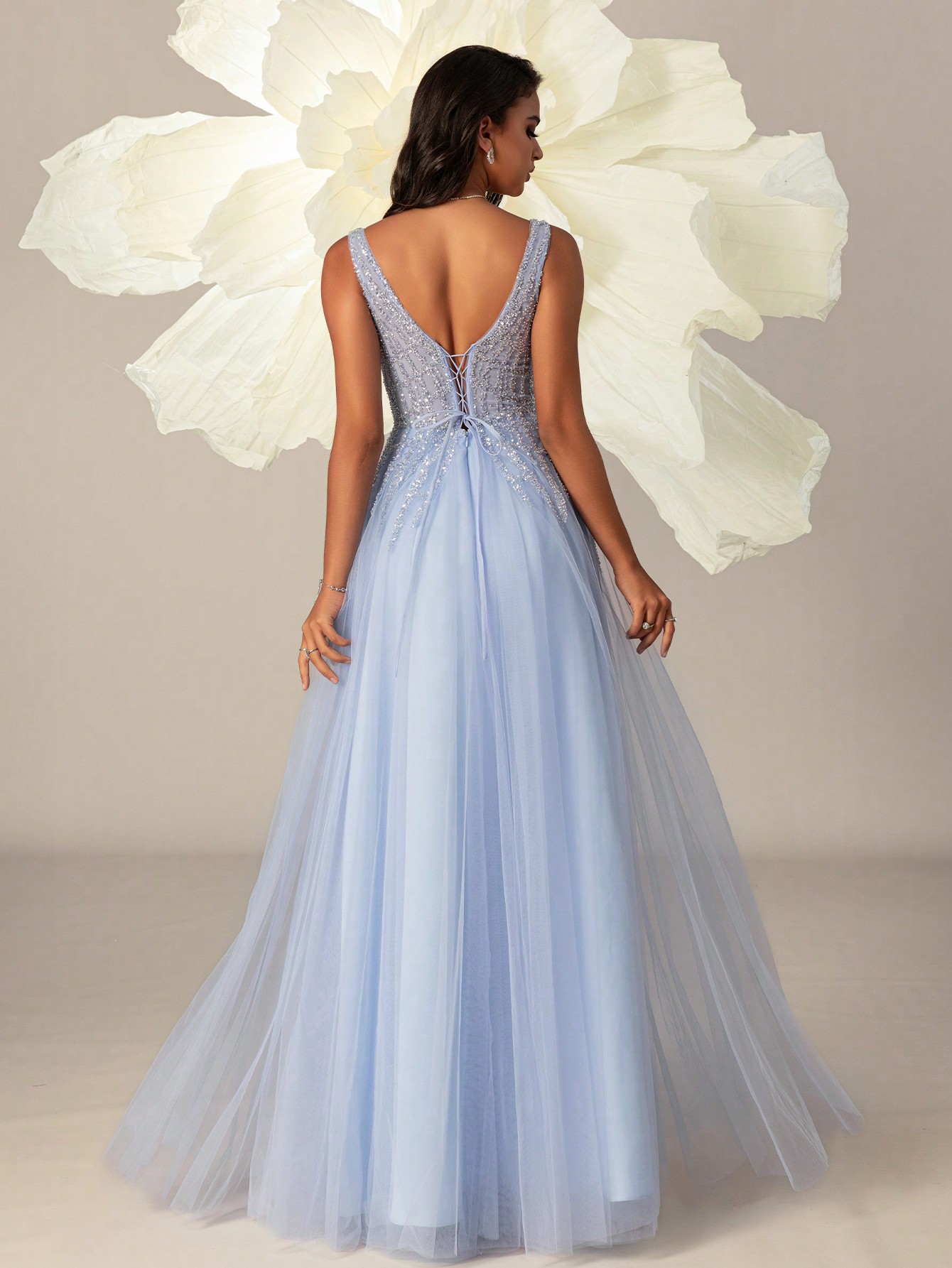 A fairytale night awaits you in this gown! The Cinderella Gown is fit for a princess with a multi layer tulle skirt and hand sewn crystal and sequin embellishments! This dress features a side leg split, illusion V neckline, padded bust and corset style tie up back. Just don't forget your glass slippers with this cute fairycore gown!