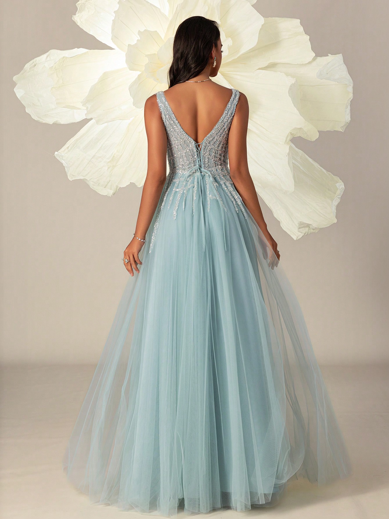 A fairytale night awaits you in this gown! The Cinderella Gown is fit for a princess with a multi layer tulle skirt and hand sewn crystal and sequin embellishments! This dress features a side leg split, illusion V neckline, padded bust and corset style tie up back. Just don't forget your glass slippers with this cute fairycore gown!