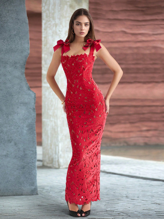 The Claire Dress is an elegant, floor-length lace gown that effortlessly blends sophistication with a touch of allure. Featuring luxury leaf-pattern lace with subtle nude underlay, this figure hugging silhouette is designed to flatter your curves. The statement shoulder bows add a playful detail, while the fabric offers a hint of stretch for comfort and ease of movement. Perfect for a wedding, birthday, or engagement party.