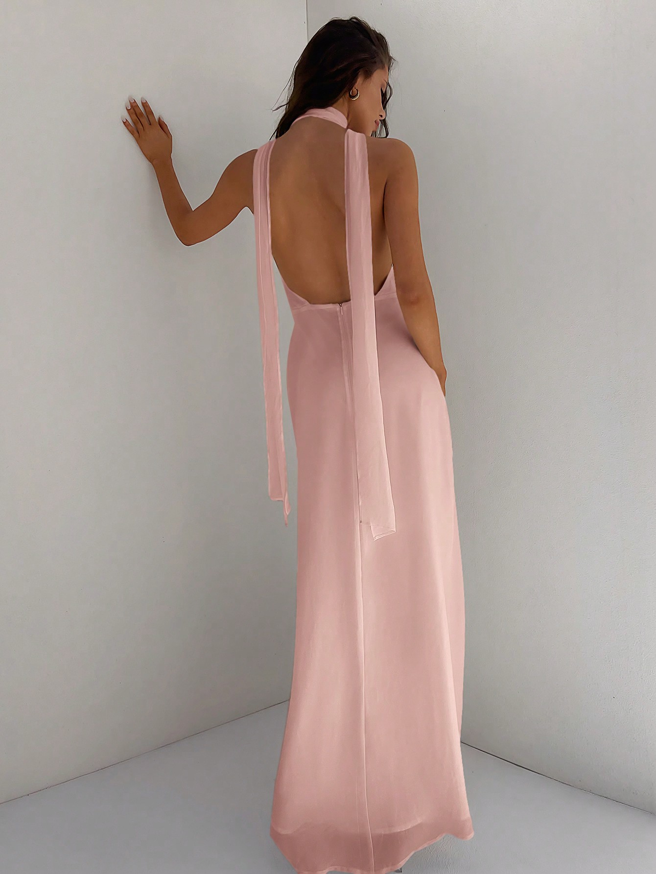 Style her how you like! The Hazel Gown is a stunning dress with flowing straps which you can tie how you like - halter, bow, scalf etc. This gorgeous gown features a plunging V neckline, open back with rear zip, and size leg split. This dress is fully lined with a chiffon overlay.