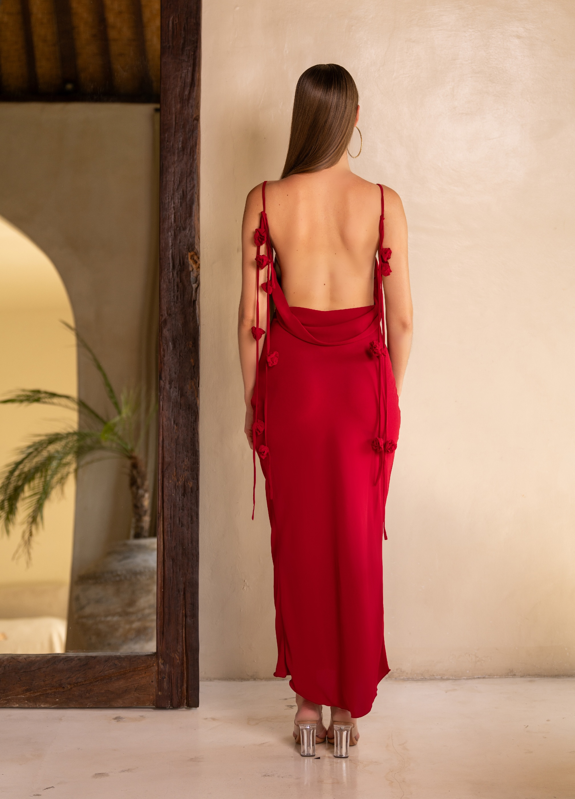 Allegra features our signature backless cowl design with adjustable straps. The neckline is one shoulder with the centrepiece of this design being the flower rosary which can be worn in a number of different ways - around the neck or draped over the shoulder.