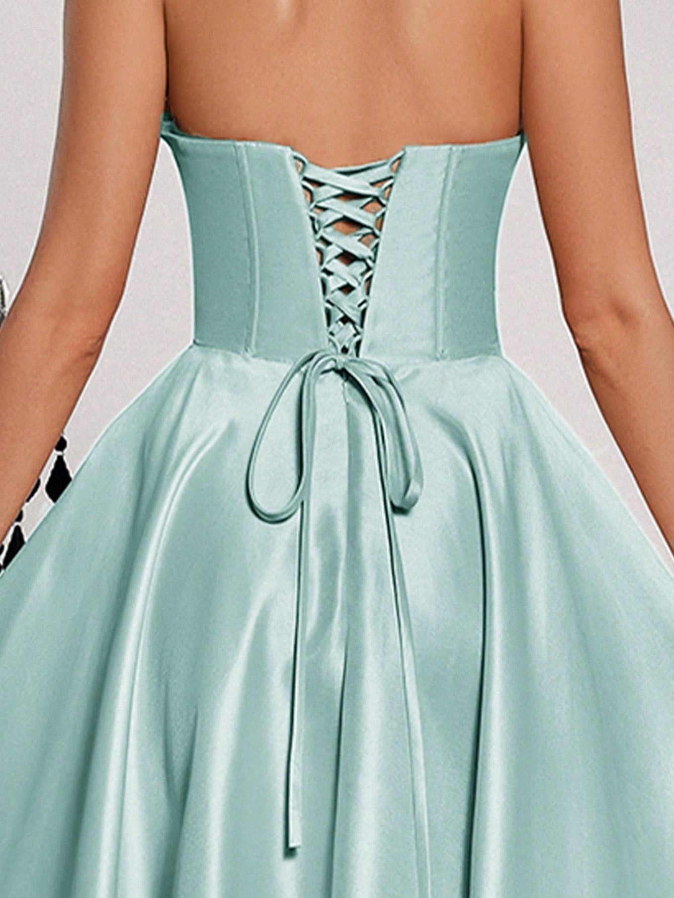 This modern ball gown will turn heads at your next formal event. Made from stiff satin fabric and featuring a strapless neckline with twin peak design and padded bust, side leg split and an adjustable, corset style back. Perfect for a prom or red carpet affair. The fabric has no stretch.