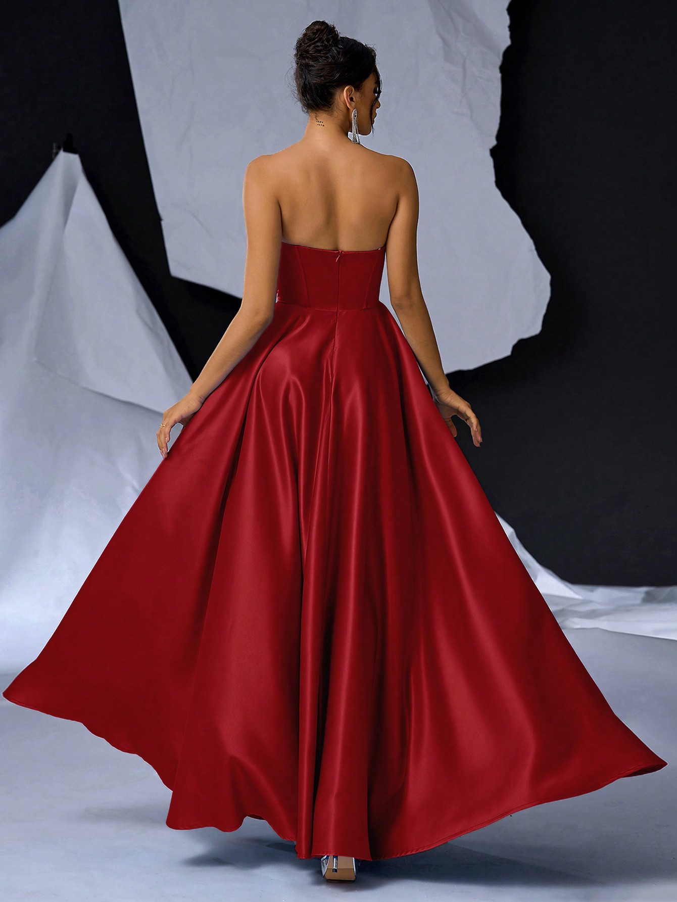 The Jemma Gown is a captivating strapless evening dress featuring a structured padded bodice with subtle boning and delicate sequin embellishments along the neckline for a touch of glamour. Designed from a luxe satin fabric with minimal stretch, it flows into a voluminous A-line skirt. Ideal for proms, formal weddings, galas, or red carpet-style events, this gown delivers a show-stopping silhouette with timeless appeal.