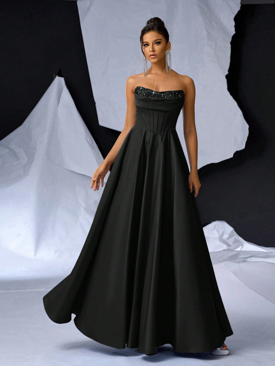 The Jemma Gown is a captivating strapless evening dress featuring a structured padded bodice with subtle boning and delicate sequin embellishments along the neckline for a touch of glamour. Designed from a luxe satin fabric with minimal stretch, it flows into a voluminous A-line skirt. Ideal for proms, formal weddings, galas, or red carpet-style events, this gown delivers a show-stopping silhouette with timeless appeal.