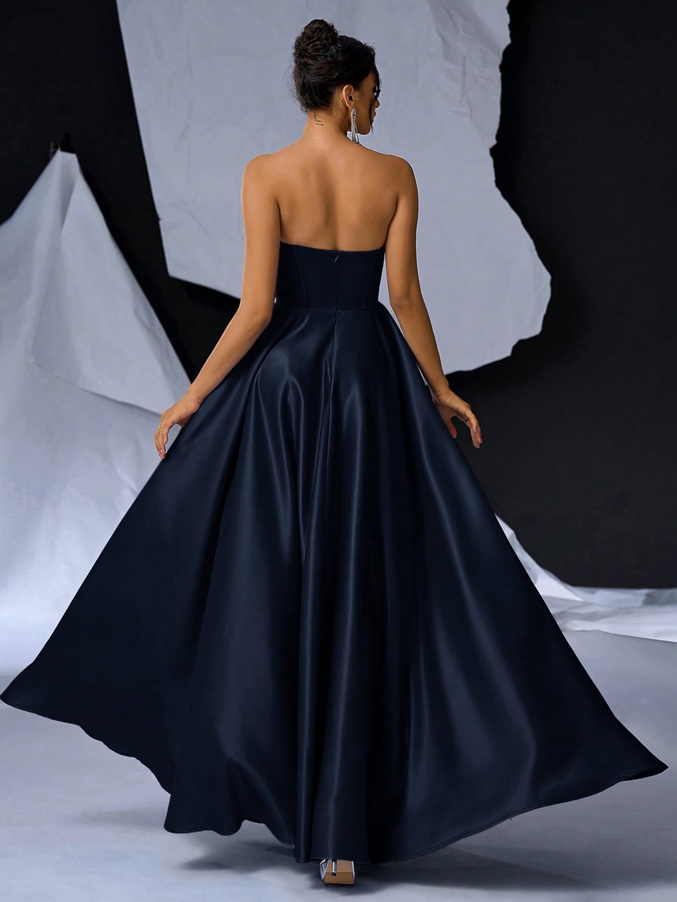The Jemma Gown is a captivating strapless evening dress featuring a structured padded bodice with subtle boning and delicate sequin embellishments along the neckline for a touch of glamour. Designed from a luxe satin fabric with minimal stretch, it flows into a voluminous A-line skirt. Ideal for proms, formal weddings, galas, or red carpet-style events, this gown delivers a show-stopping silhouette with timeless appeal.
