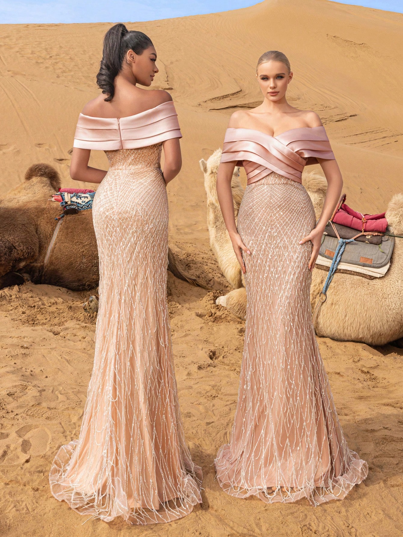 The Jennifer Gown is a striking couture gown which is hand embroidered with luxury beading and sequins. The Jennifer Gown subtly hugs the figure at the waist while the skirt slowly flares towards the ground. The bodice has been designed with a wrap around bust and delicate sleeves. The design is both bold and timeless, perfect for a mother of the bride or wedding guest. Be the toast of the room at your next formal event. This dress has a rear zip, no stretch and is fully lined.
