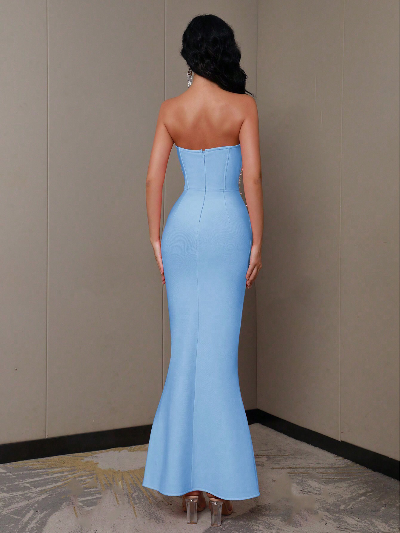 Show off your curves in this gorgeous, figure hugging number. The Luna Dress features a strapless neckline, side leg split and is embellished with crystals along the neckline. Whether you are looking for a birthday dress, formal dress or cocktail number, the Luna Dress is a sure choice.