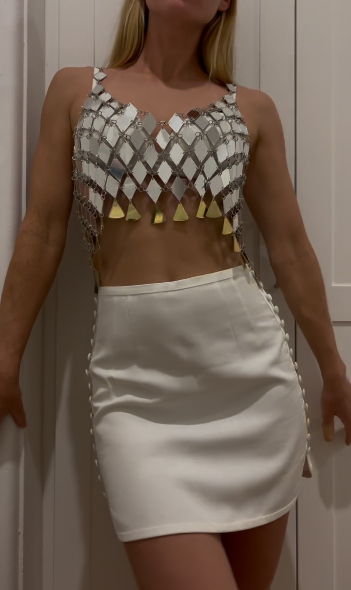 ✨The Mirror Crop is a fun little crop top that is unique and sure to turn heads. This sparkly bralette with diamond shape mirrors has three adjustable chains in the back for the perfect fit. Wear her to date night, a festival, rave, birthday or night out on the town. This top is not lined.