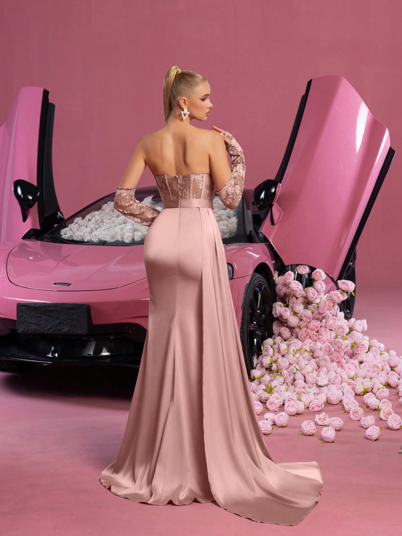 The Monaco Gown combines classic and contemporary elements for a truly stunning look! It features optional delicate lace sleeves that add a touch of romantic charm, while the strapless lace bodice with built-in padding provides both structure and support. The flowing satin skirt drapes gracefully, enhanced by a daring side leg split. This dress has a rear zip and no stretch, so we recommend ordering 1 size up.