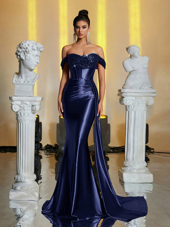 The Myla Gown has just landed! This stunning formal dress features a structured corset bodice with padded bust, ruched fabric detailing along the waist, off the shoulder straps and a floor length skirt with small train. The neckline has been designed with gorgeous embellished tulle detailing that sparkles with beads and sequins. The zip is located at the back of the dress and the fabric has a high stretch level.
