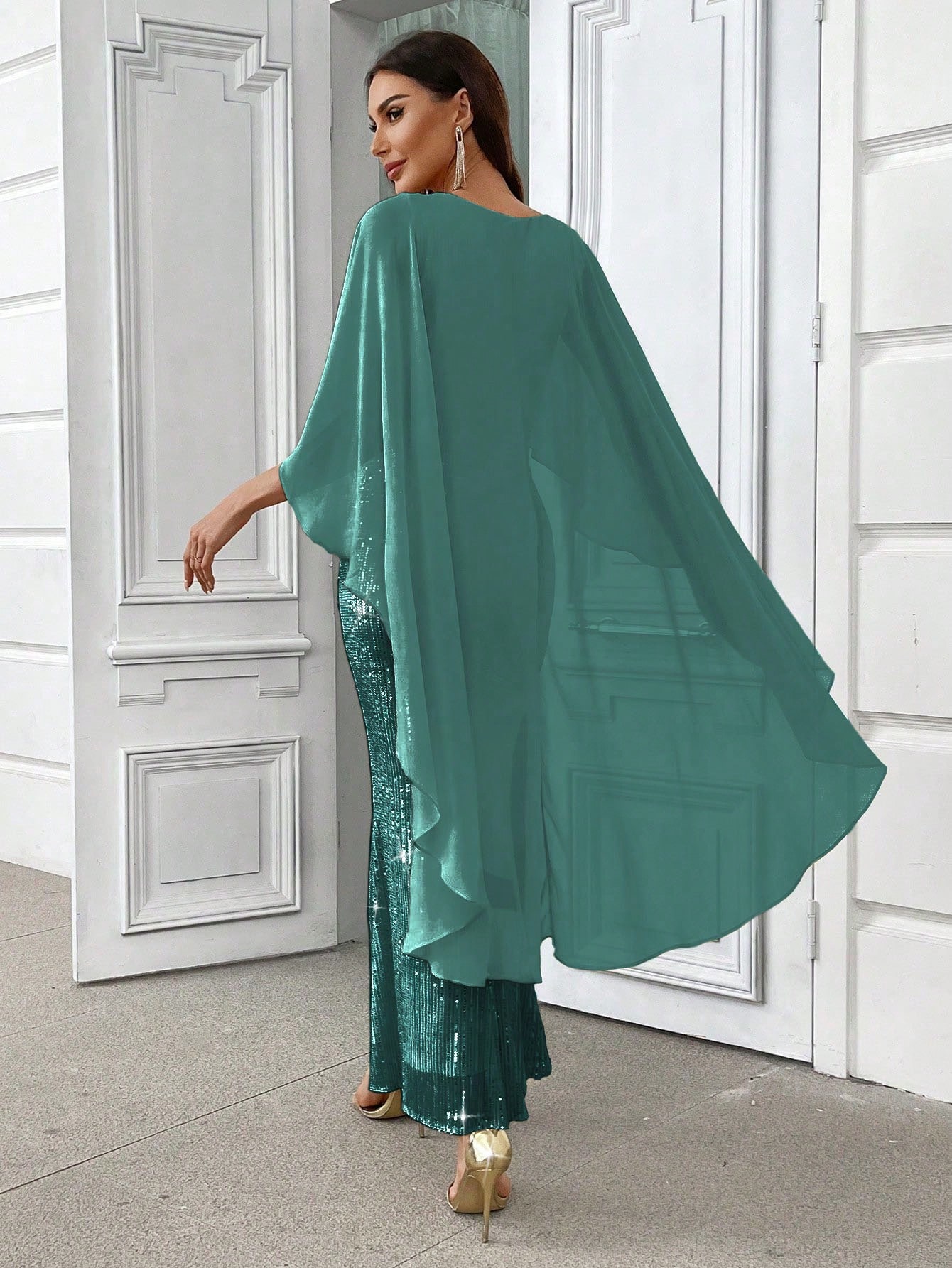 This elegant sequin shawl dress is the perfect dress for your next formal event. Stylish yet modest, the Nadia Dress features a fully lined ankle length sequin dress with chifon shawl. This dress is made from premium stretch sequin fabric. We can see the Nadia dress on the Mother of the Bride or at a cocktail affair.