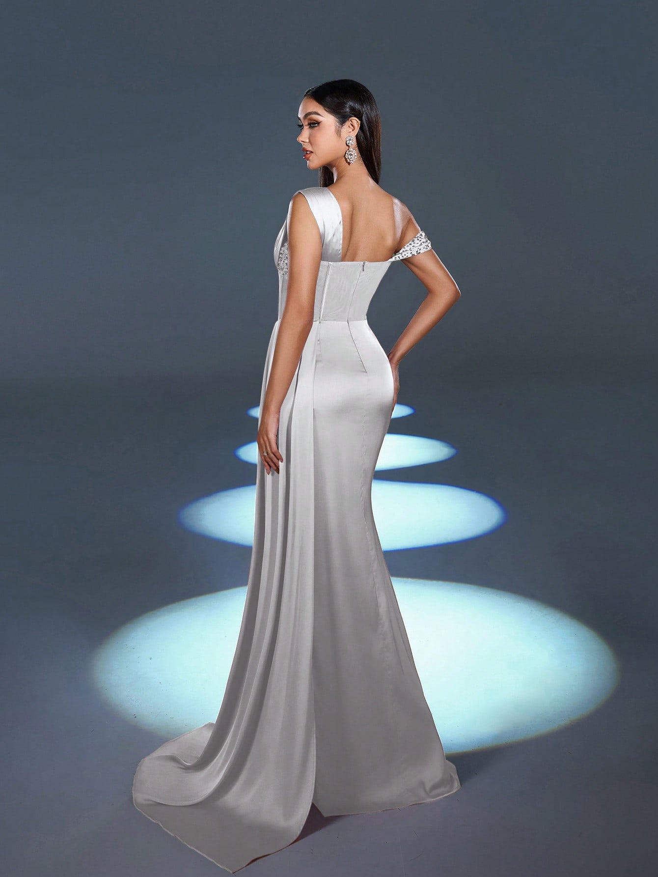 The Sarah Gown is effortlessly beautiful! It drapes across the body in an elegant but casual way. Designed with a corset style bodice that is embellished with sequins, an off the shoulder strap, side leg split and side train. Perfect for a formal or gala! This gown is made from shine satin fabric that has little stretch.