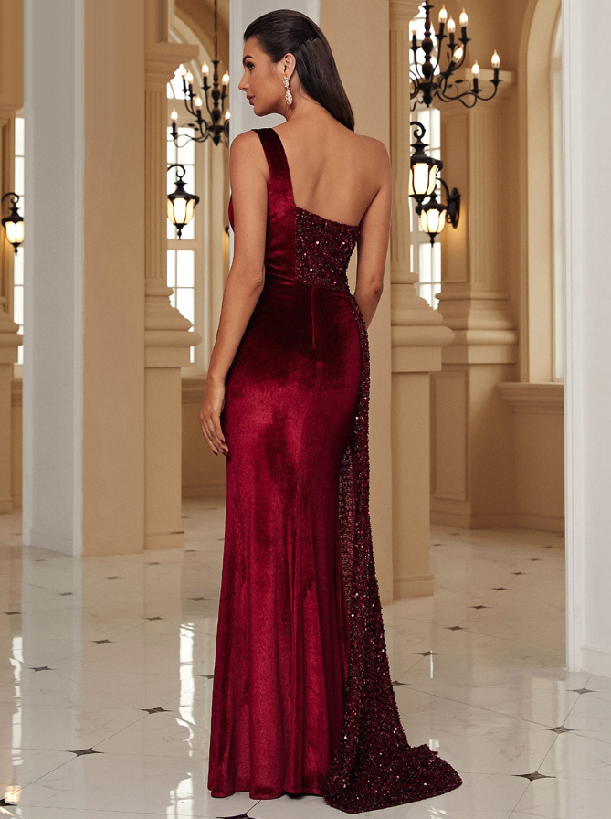 One of our favourites from the new Mila Label collection! The Shanaya Gown is a stunning two tone formal gown that has been designed with both velvet and sequin fabrics. This gown features a one shoulder style neckline with sequin padded bodice. The skirt is designed with a side leg split and sequin side bustle train. The zip is located to the rear and the gown has a moderate amount of stretch. This gown would be perfect for bridesmaids or a year 12 formal.