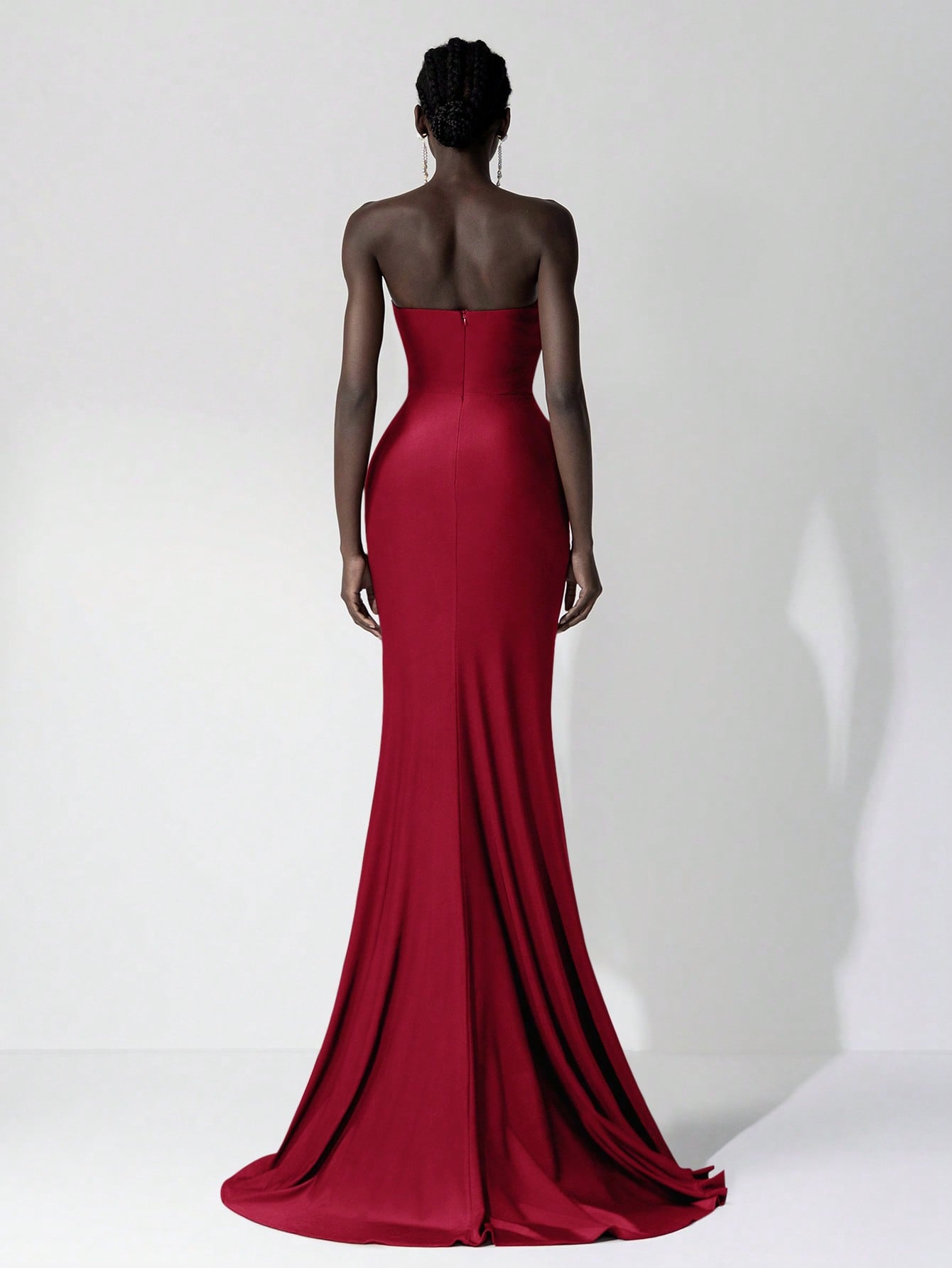 The Shelly Gown is a sleek, strapless masterpiece designed in a high-stretch fabric that molds effortlessly to the body for a flawless, sculpted fit. Featuring gathered ruching throughout the bodice and hips, it’s finished with a dramatic front drape that enhances its fluid silhouette. At the centre, a distinctive shell-shaped hardware detail adds a unique, eye-catching touch. This dress has a rear zip and padded bust.