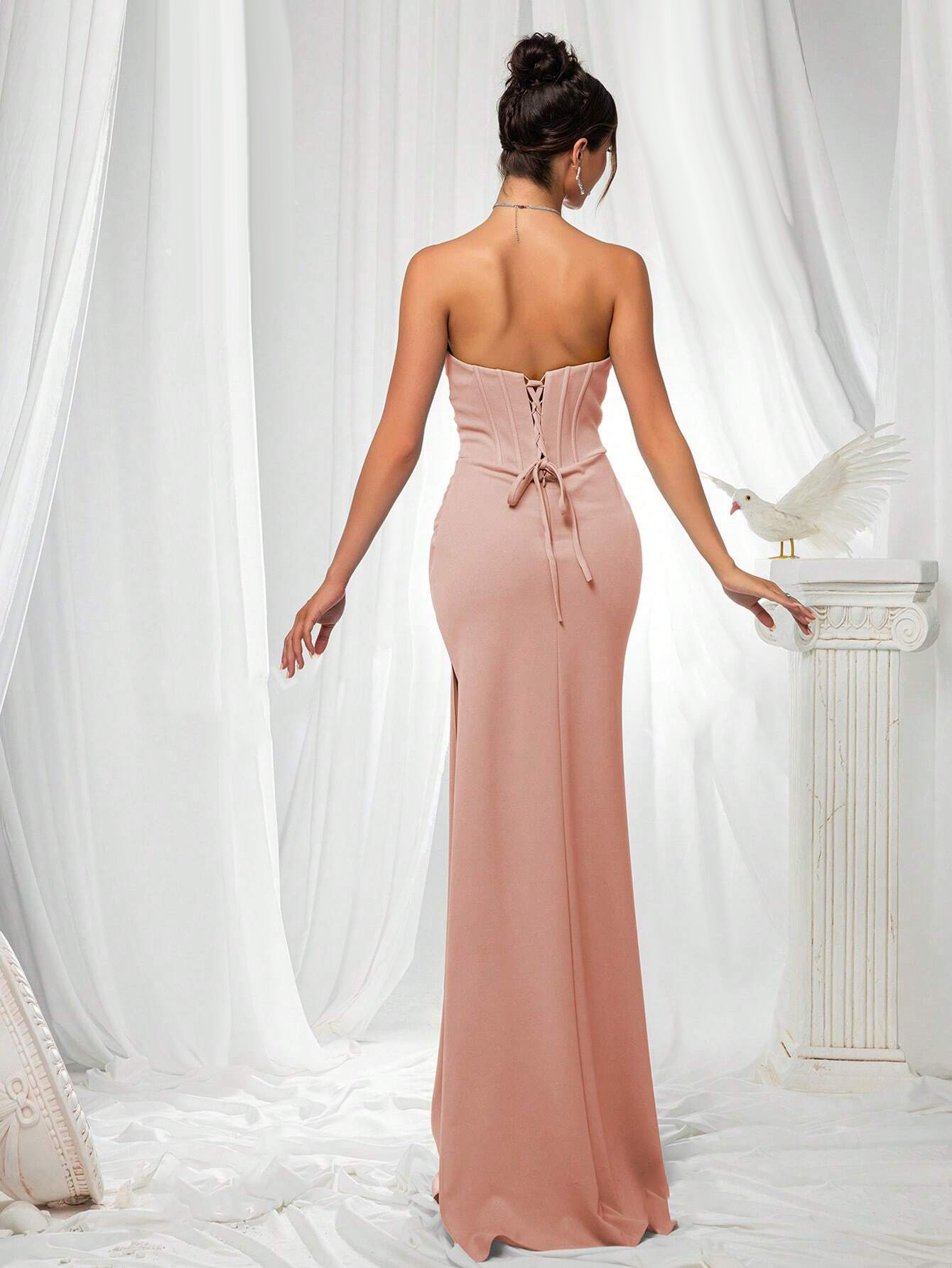 The Stella Gown has the IT factor you are looking for. The bodice is structured like a corset and is embellished with sequins in a vine design. The bodice is also slightly see-through but has built in bust cups. The long skirt is made from stretch satin and has ruching in the mid-section and a side leg split. The zip is located at the back of the dress. The Stella Gown is perfect for a Year 12 Formal or for bridesmaids.