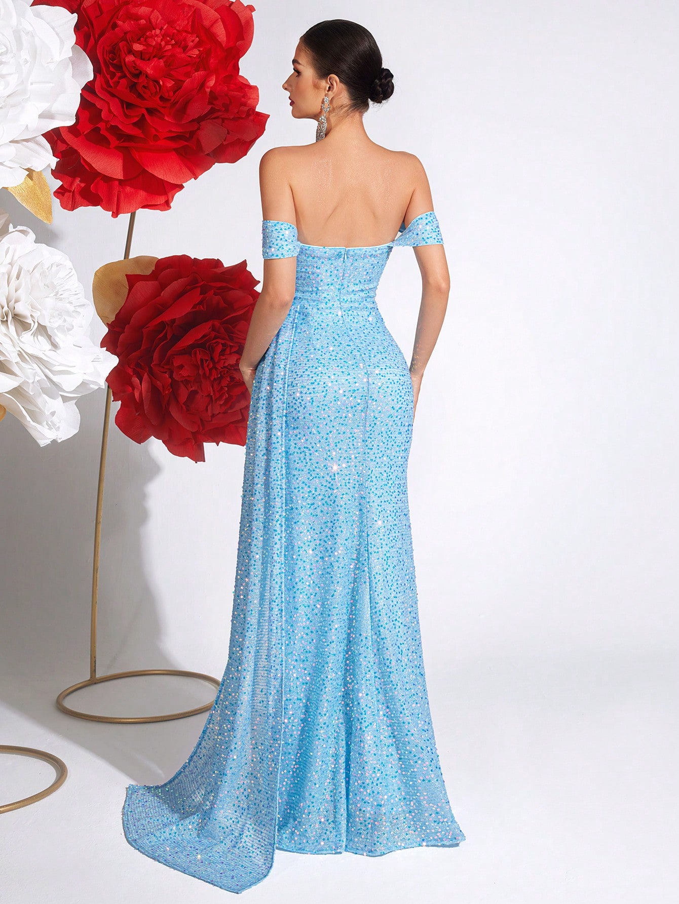 Bring the sparkle! The Tyra Gown features off the shoulder straps with a corset style bodice, sweetheart neckline and side leg split. This gown has been designed with a figure hugging mermaid silhouette and side train. Made from premium sequin fabric with tie up corset style back. The Tyra Gown is perfect for any formal occasion!