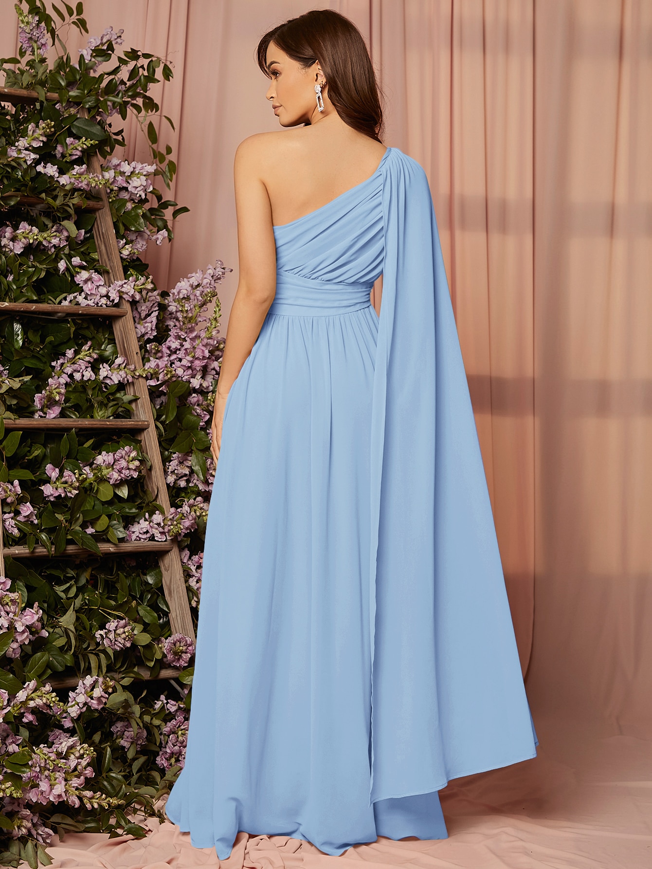 The Alina Gown has that effortless look! Made from a chiffon overlay, this dress is fully lined. Designed with a side leg split, side zip and one shoulder neckline with flowing shoulder train. This dress is perfect for bridesmaids, Prom, a gala or wedding guest.