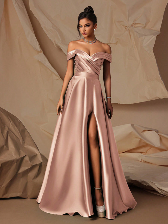 The Miccah Gown is an elegant off-the-shoulder gown designed to make a statement. Featuring a flattering crossover bodice with pleats, leg slit, and an adjustable tie-up back for a personalized fit. This gown is crafted from a smooth thick satin fabric that does not have much stretch, ensuring a structured and flattering silhouette.
