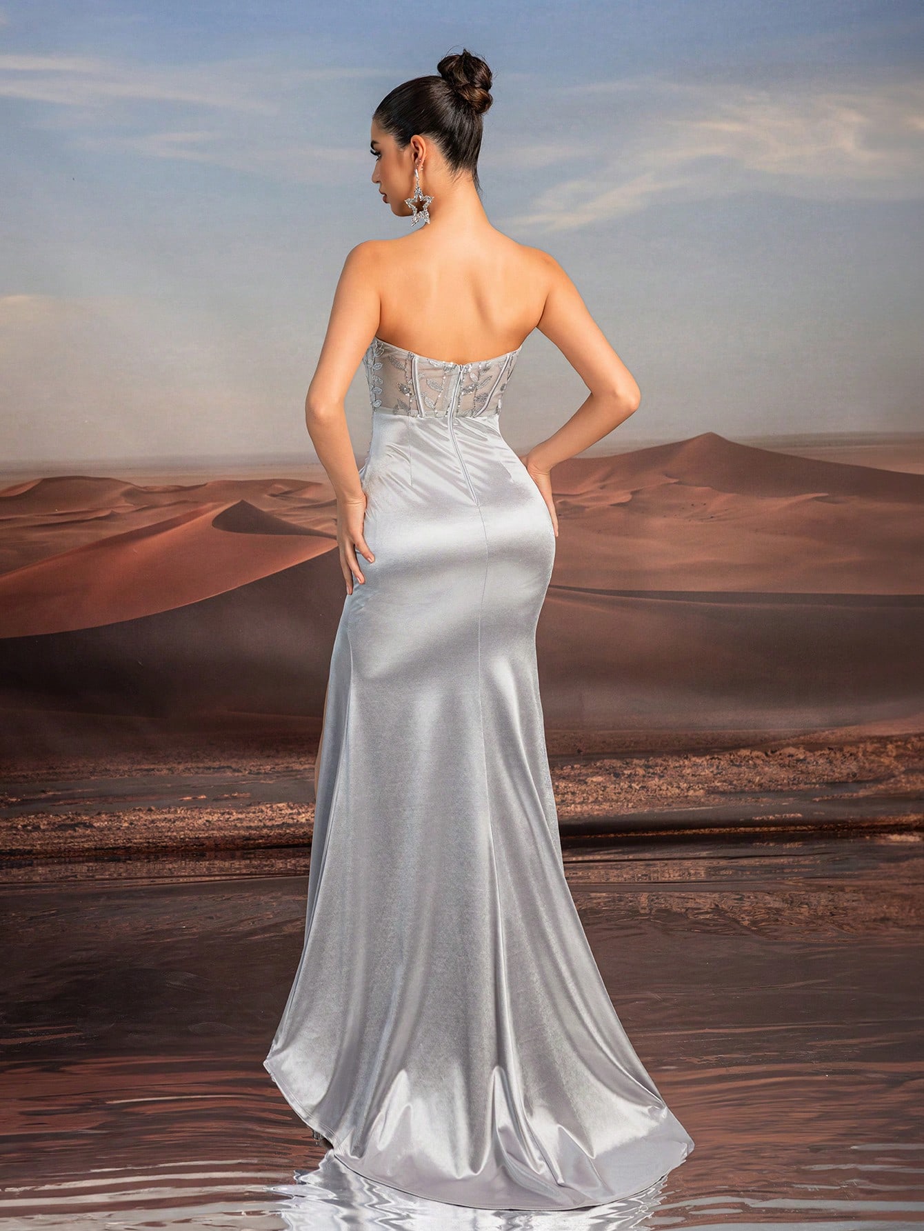 The Stella Gown has the IT factor you are looking for. The bodice is structured like a corset and is embellished with sequins in a vine design. The bodice is also slightly see-through but has built in bust cups. The long skirt is made from stretch satin and has ruching in the mid-section and a side leg split. The zip is located at the back of the dress. The Stella Gown is perfect for a Year 12 Formal or for bridesmaids.